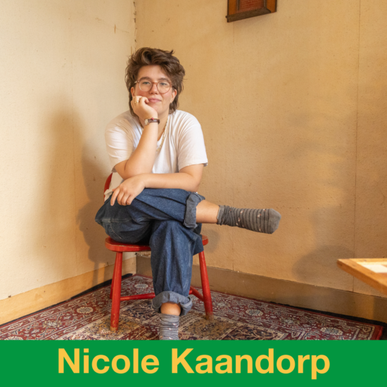 Nicole Kaandorp (Boedapest, 1997) schrijft korte verhalen, essays en podiumpoëzie. Daarnaast presenteert en organiseert ze literaire programma’s in Utrecht en haar woonplaats Amsterdam, en is ze onderdeel van de redactie van Mensen Zeggen Dingen. Voorheen maakte ze liedjes met de band Kopje Onder. In 2019 won ze de Lowlands Schrijfwedstrijd met het korte verhaal ‘Linnen‘, over een stel dat speelt dat ze elkaar niet kennen, met alle gevolgen van dien. Onconventionele relaties komen vaker terug in haar werk, evenals roezen, troost en heldere details. In 2023 won ze het NK Poetry Slam.
