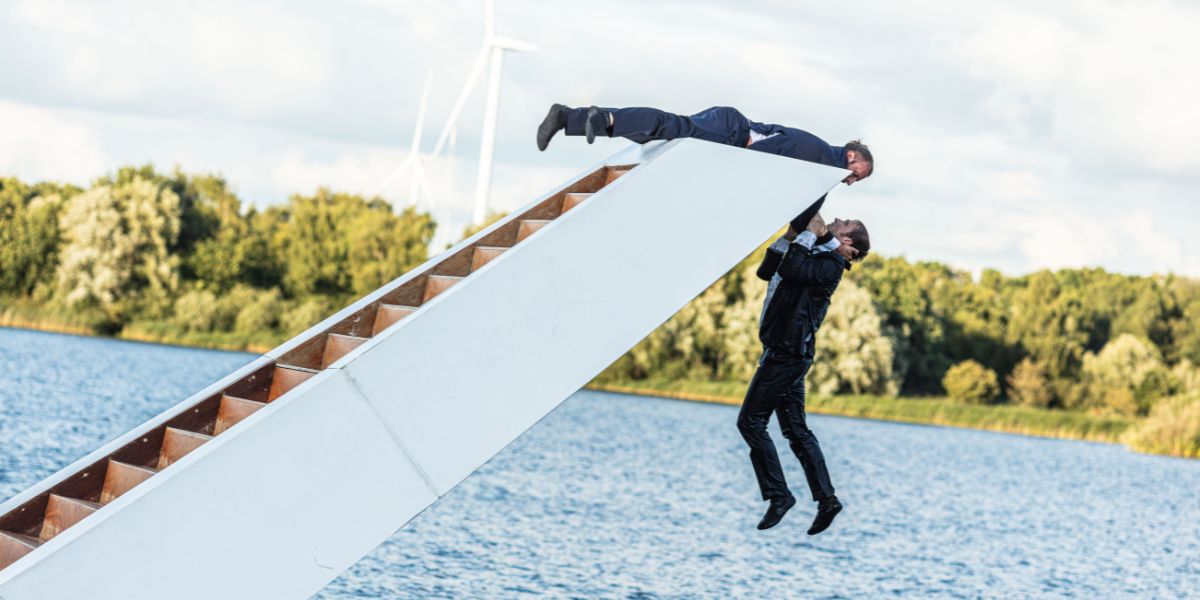 Al snel blijkt hoe wankel de trap is: als één van de opvarenden zich naar de andere kant verplaatst, kantelt het geheel en moet de rest onmiddellijk reageren om niet uit te glijden en in het water te vallen. Er staat dus veel op het spel, het risico is continu voelbaar voor het publiek.