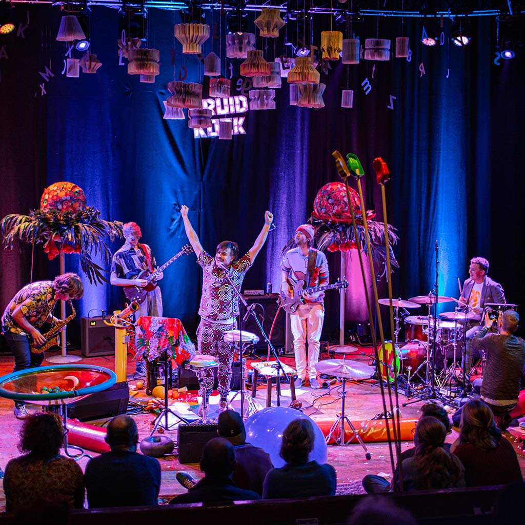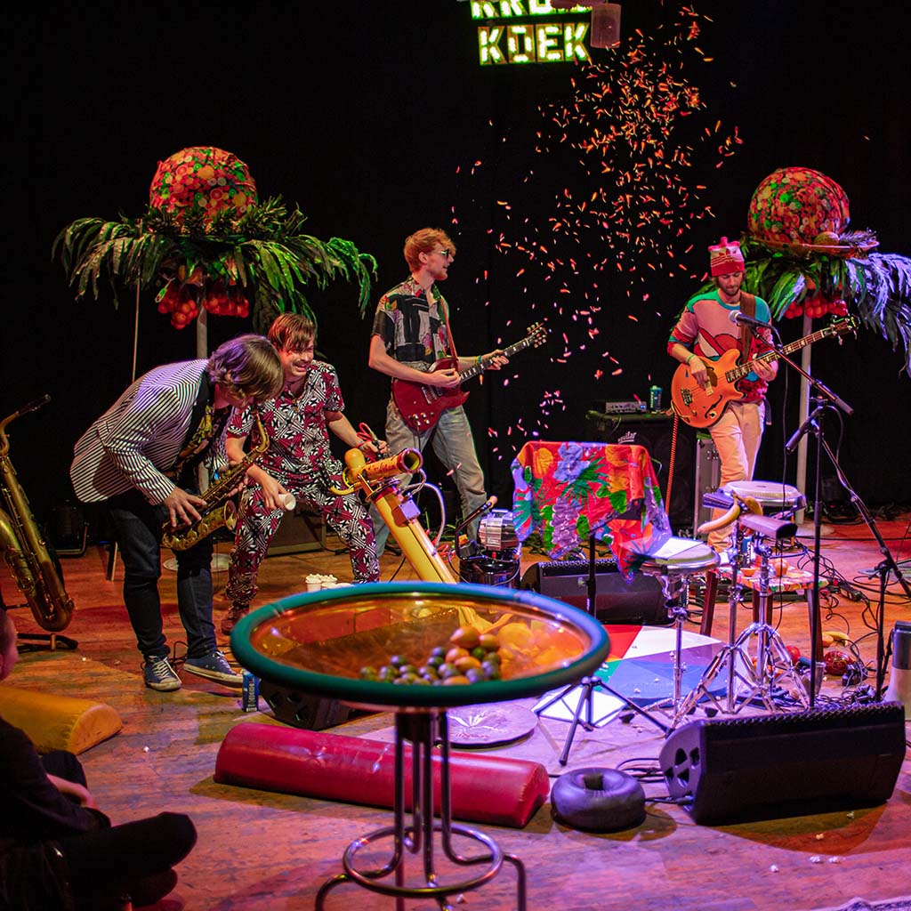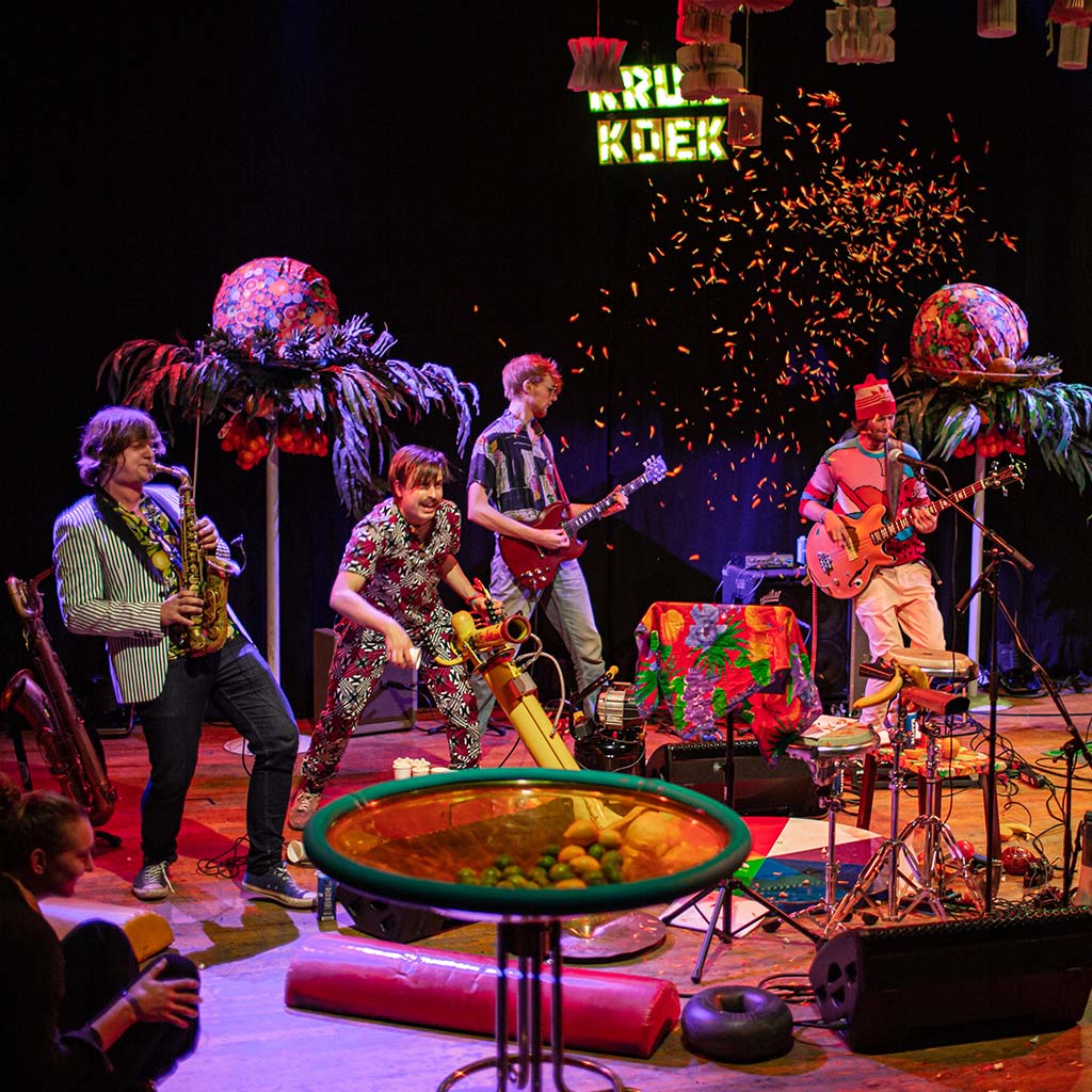 In een tijd waar het aanpraten van angst en woede het enige gereedschap van politici lijkt, is het zaak om het aanpraten van het tegenovergestelde, vrolijkheid en gelukzaligheid, zeer gedegen te onderzoeken. Precies dat doen schrijver, dichter en performer Joost Oomen en de garagejazzband Kruidkoek met de muzikale en literaire voorstelling Vruchtjes Eten. Zonder verhaallijn, zonder moraal, maar met kleuren en vruchten in een hecht en gelijkwaardig huwelijk van muziek en poëzie.